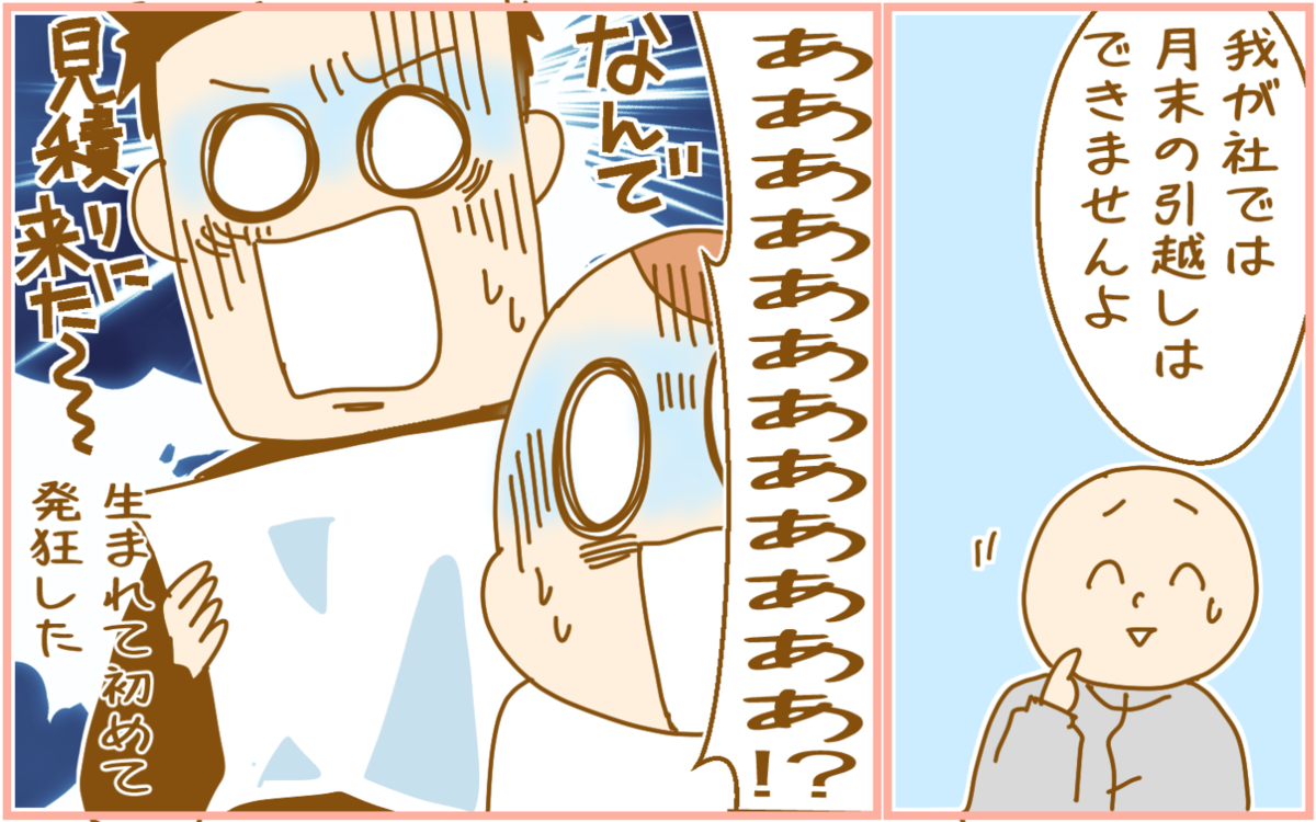 職場のなんやかんやの後に引越し業者のこれで、妻の私は怒りMAX、バーサーカーと化した妻の代わりに逆に落ち着きを取り戻した夫が、営業の人に「それでは意味がないのでお引き取りください」と送り返していました。