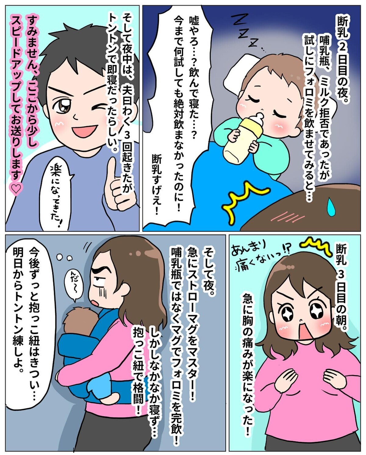 断乳1日目、夫に寝かしつけをお願いし、出産以来初めて1人でぐっすり眠ることができたえなり。目覚めると顔色が見違えるほど良くなり、睡眠の大切さに気づくのでした。恐れていた乳腺炎も無事クリアし、断乳2日めの夜を迎えますが…。