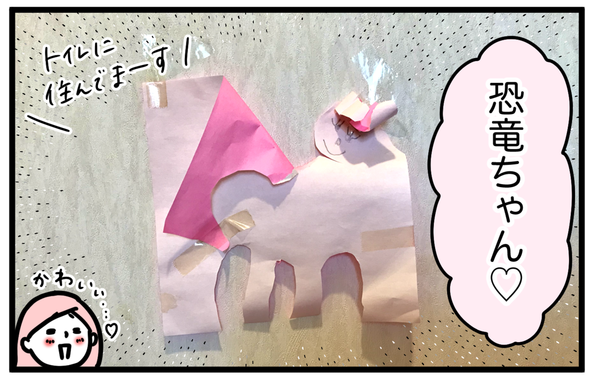 トイトレで大活躍した折り紙の恐竜…ひそかに今もトイレで活動に励んでいたとは【モチコの親バカ&ツッコミ育児 第159話】