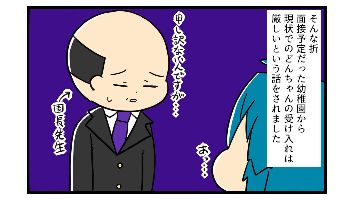どんちゃんは、兄・ぽこちゃんの通う幼稚園の面接を受けさせてもらう予定でした。この幼稚園では、在園児に兄・姉がいて、入園希望者が定員以上の場合は、優先的に入園させてもらえることになっていたからです。しかし、残念ながら、どんちゃんは入園面接がある日よりも前に、園長先生からじきじきに入園を断られてしまったのです。