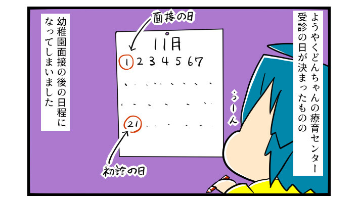 時は11月。どんちゃんの兄、ぽこちゃんの通う幼稚園では、入園面接が始まる時期です。幼稚園の入園面接よりも、専門機関の受診は後の日程になってしまうため、動き出しが遅かったことをとても後悔していました。
