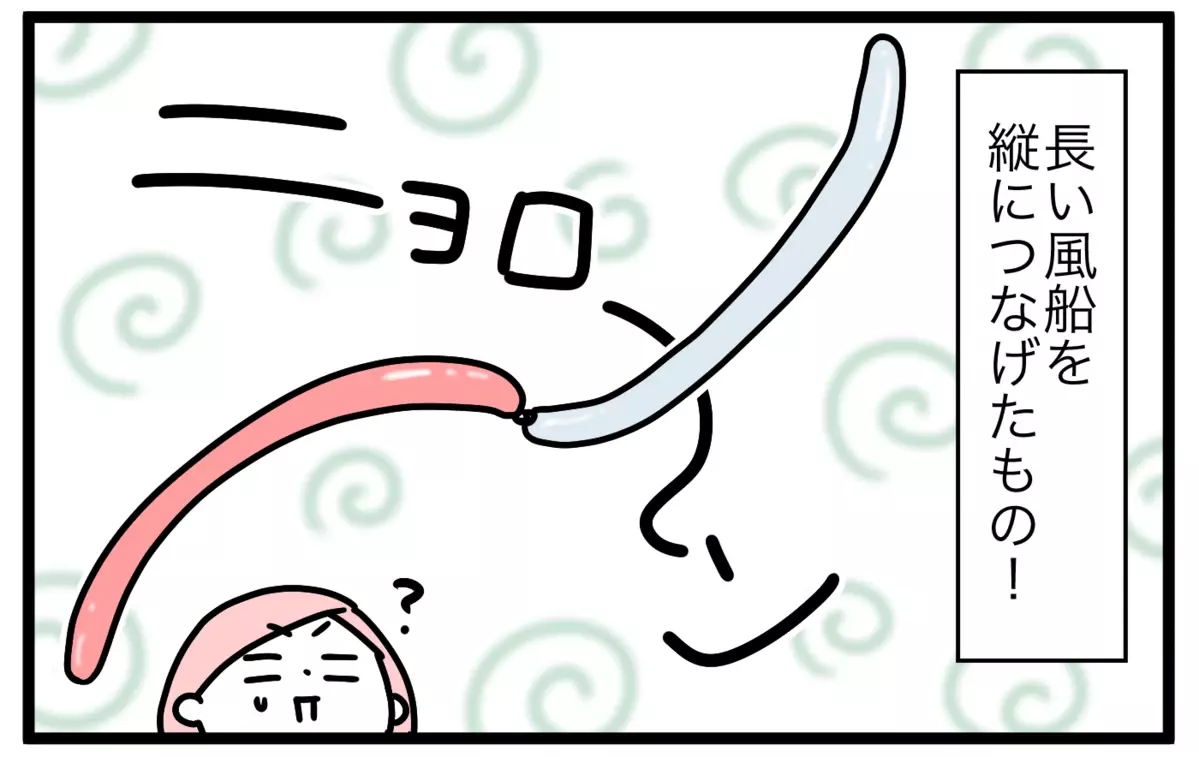 よくバルーンアートで使うあの長ーい風船2本を、口のところで結んでつなげたものです。