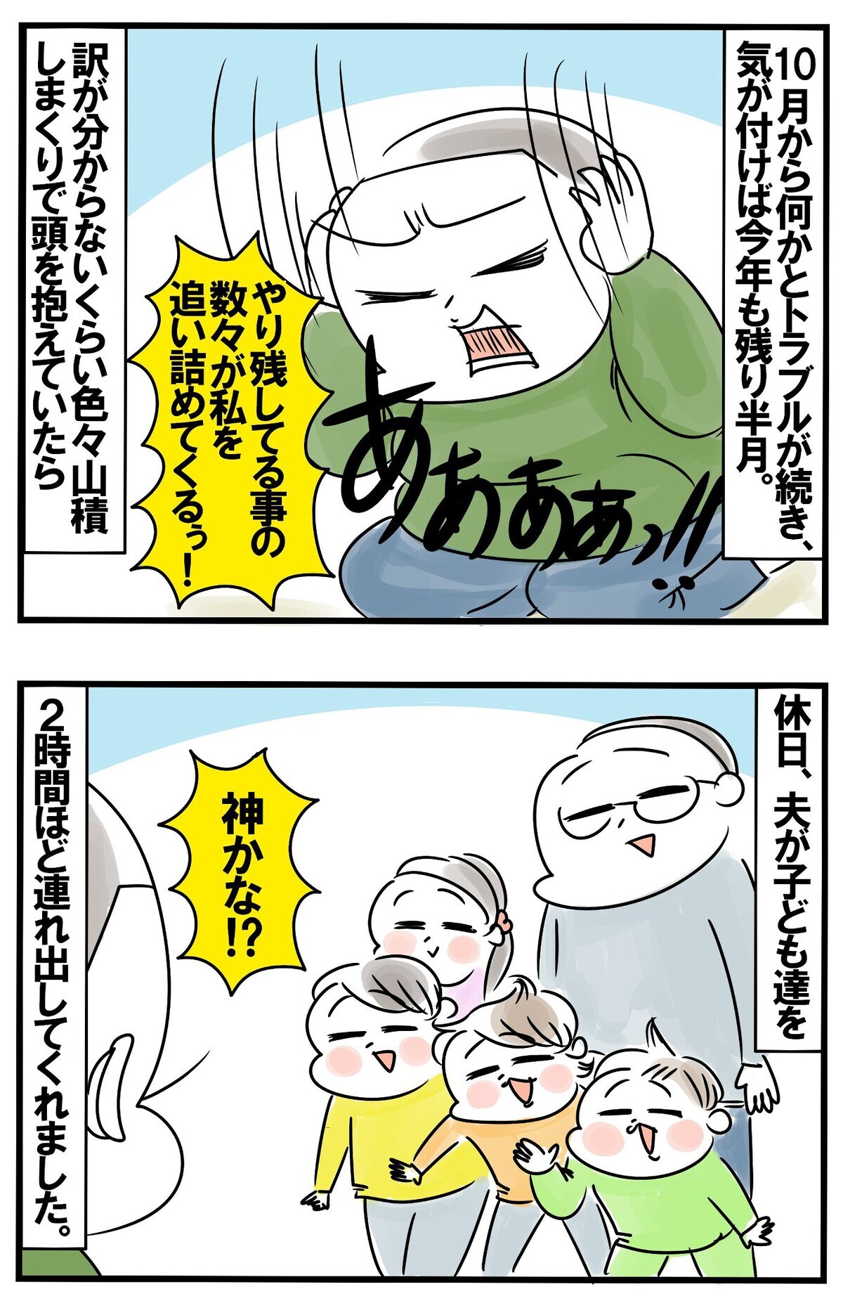そんなこんなで例年通り、いや、例年以上にバタバタしまくりで頭を抱えている妻のために、休日、夫が昼から子ども達を遊びに連れて行ってくれることに。