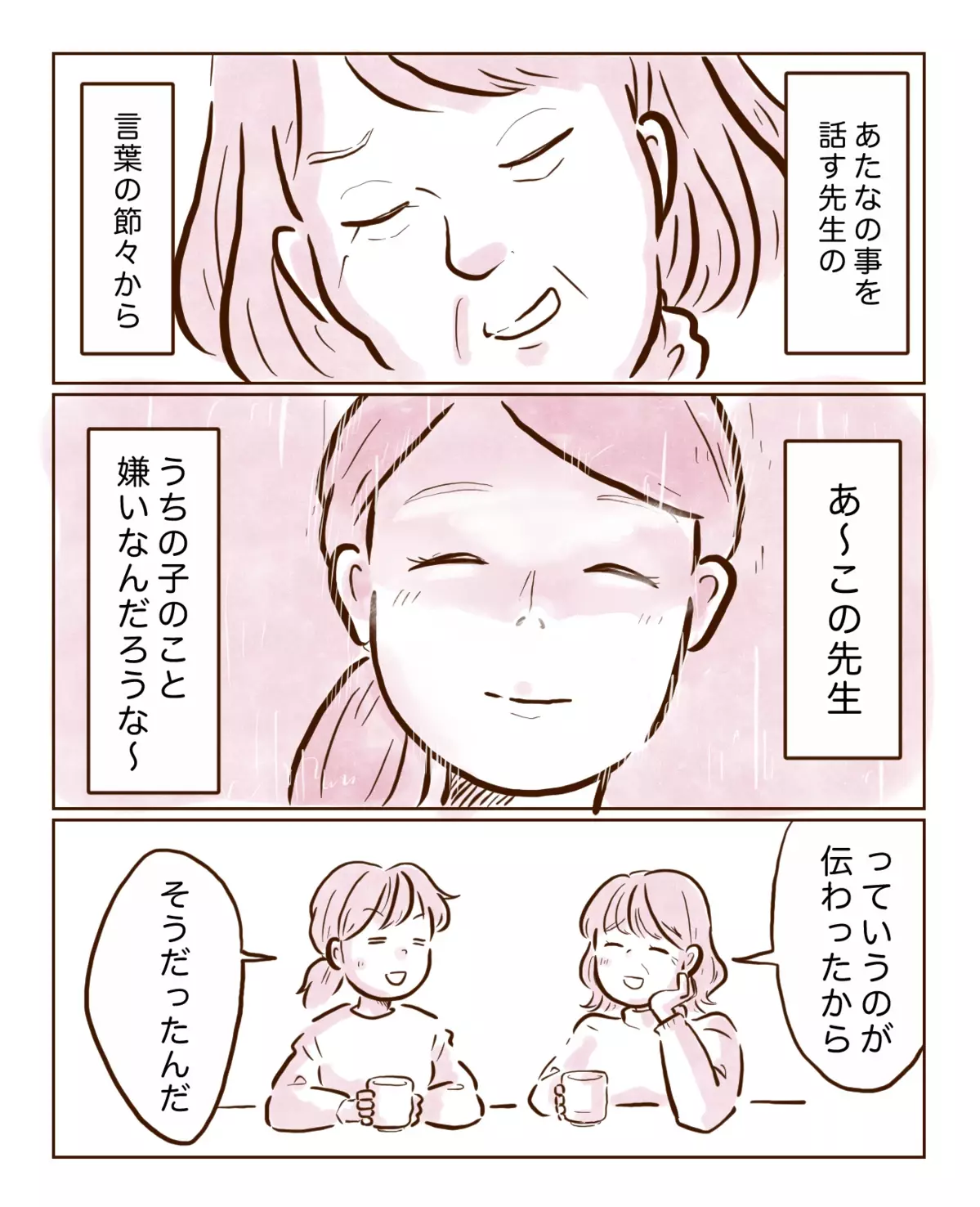 担任に虐められていたとチッチママが言うと「やっぱり」と言っていた母。母は当時から気づいていた…? 個人面談で担任の先生と話したときのことを母が話してくれました。