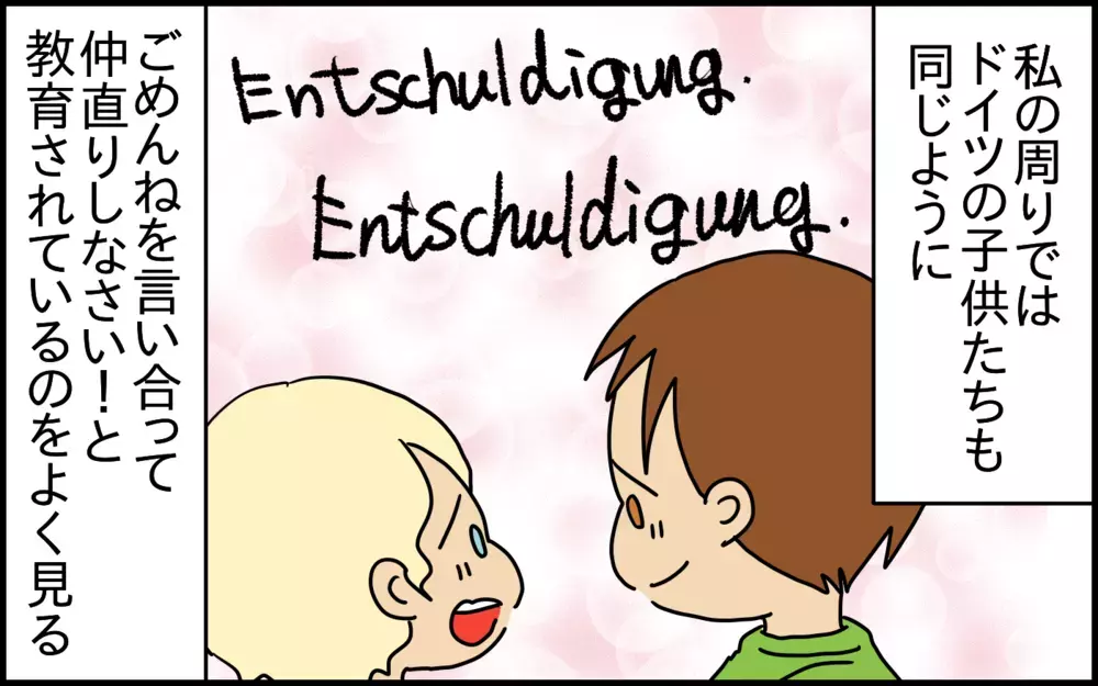 そんなとき、私が見る限りでは多くのドイツ人ママさんたちも、日本と同じように「お互いにEntschuldigung(ごめん)を言いなさい、それで納得して、遊びを続けなさい」と教育していますから、根本は同じのはず。