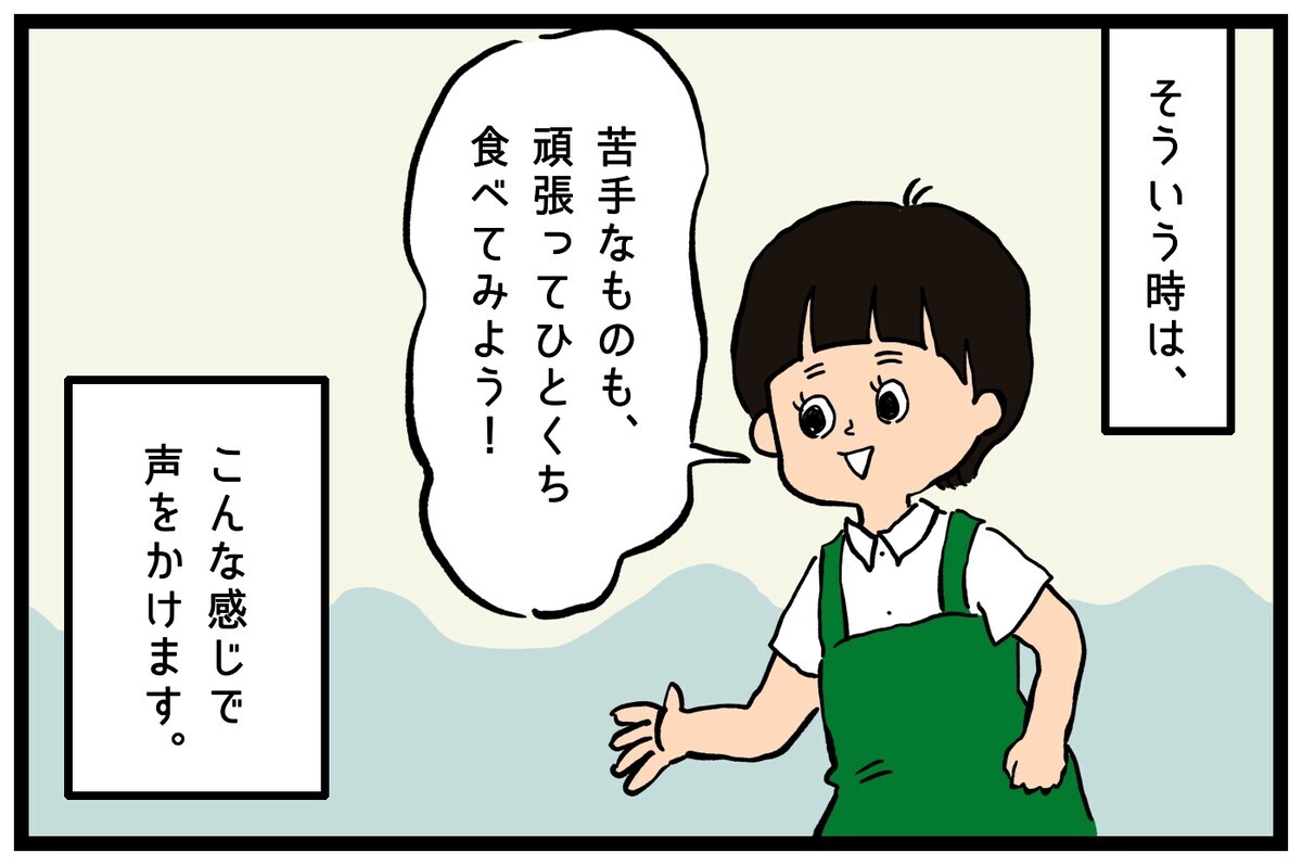 無理やり食べさせることはしませんが、苦手なものも食べられるようになってほしいという思いから、「ひと口食べてみよう」と声かけをします。反応はさまざまですが……だいたいの子がひと口ならと頑張ってくれます。