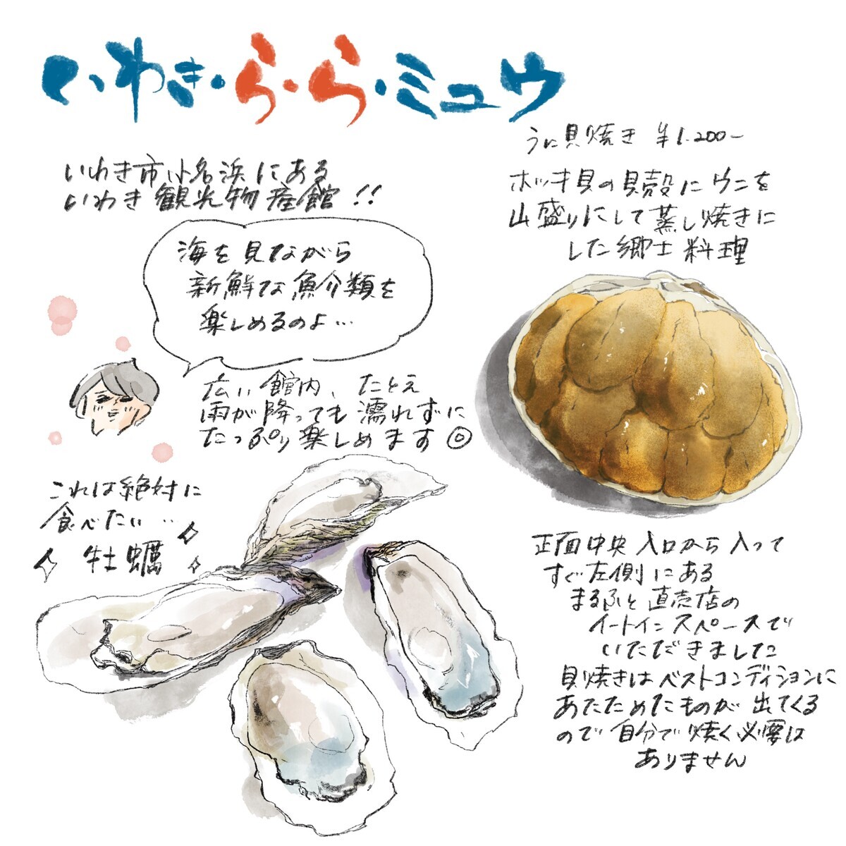 「いわき・ら・ら・ミュウ」は小名浜港で水揚げした新鮮な魚介類を楽しむことができる商業施設。活気あふれる市場の雰囲気を楽しみながらお昼ご飯を吟味します。やはりこういった場所では購入したものをその場でいただくのが楽しいですね。