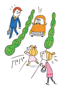 交通安全では、「止まる・待つ・見る」の3つが大切です。横断歩道があったら、「ここでは、この位置で止まって待つんだよ」と、その場で具体的に教えてください。子どもに歩道と車道の境界線の所で待つように言うと、本当に線ギリギリの所で待つことが多いんです。