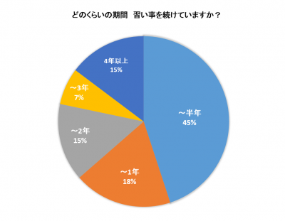 習い始めて半年以内が全体の45%、次いで1年が18%、2年以内が15%、4年以上続けている方が15%でした。