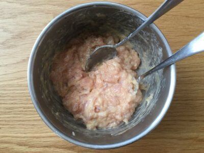 2.ボウルに1の胸肉、塩コショウ、ナツメグ、マヨネーズ、卵、小麦粉を入れて粘りが出るように混ぜます。水分が多いようなら小麦粉で調整してください