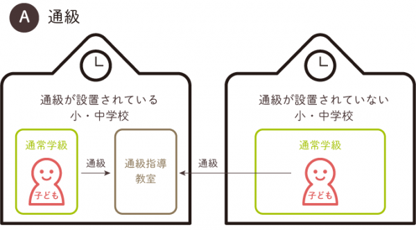 通級指導教室へ通う子どもは、多くの時間を通常の学級で過ごします。つまり、通常級に籍をおきながら、支援が必要な課題(ある特定の困りごとや、その困りごとから来る学習上の問題)だけを改善するために通級指導教室へ通い、そのほかの授業や活動は通常の学級で行います。