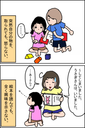 元々娘は、物に執着がなく、物事にも興味がない…2歳半でその特性が現れ始め、健診の「発育遅れ」に引っかかっていました。
