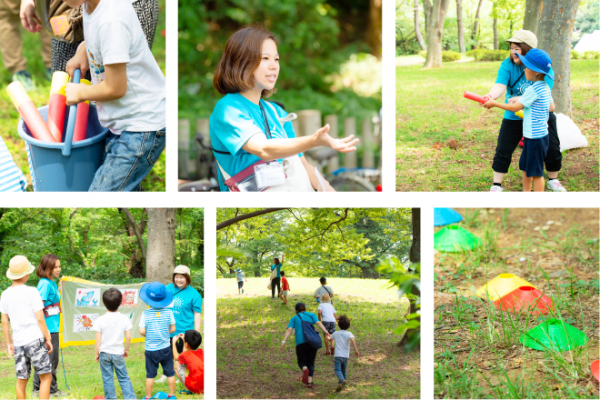 8月のとある土曜日。午前中に代々木公園で行われている集団療育プログラム「あおぞら療育」に同行。自然のなかでのびのびと活動すると、五感を目いっぱい働かせることができるのだそう。今回集まった4人の子どもたちは、元気いっぱいの子どもたち。まずは、「えいえいおー!」とみんなで声を上げて、公園の入り口付近から、公園内の活動場所まで走って向かいます。