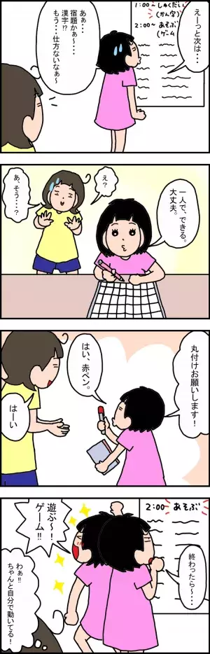 私がやらせようとしたら嫌がっていた宿題も、時間になれば仕方なくですが動きます。せっかくの夏休みに窮屈なものを作ってしまったかと思いましたが、娘にとっては先の見通しが立つ安心につながったようでした。