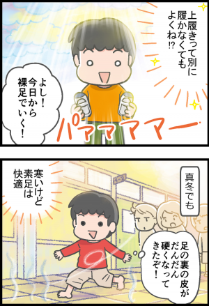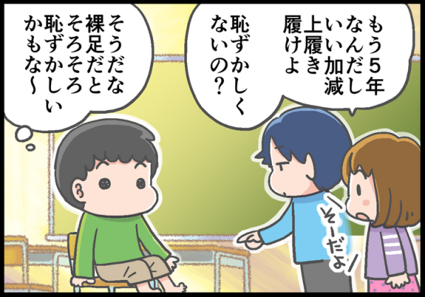 いつもは周りの意見に耳を傾けない息子ですが、このときは何故か「そうか、小5にもなったし、裸足でいるのって恥ずかしいのかもな~?」と、はじめて感じたのだと言います。