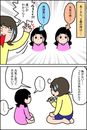 2歳までの娘は、テンションの上がり下がりがあまりなく、元気なのか具合が悪いのか、周りが察することもかなり難しい子でした。さらに小食で、食欲のありなしは体調不良かどうかの判断にならず…あの頃の私には、熱があるかどうかのみが娘の体調の判断基準でした。