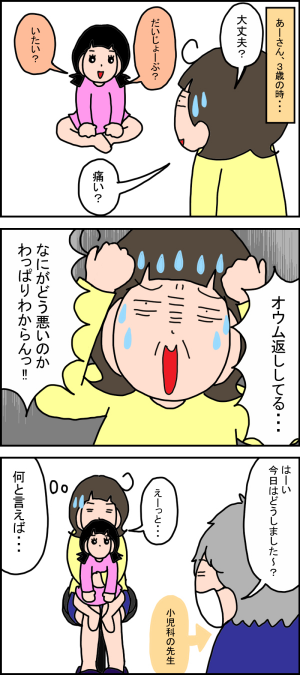 3歳を過ぎ、少しずつ単語が言えるようになってからも、会話はまだまだ成立せず…オウム返ししかできない娘は、「痛い?」と聞けば「いたい」と言い、「大丈夫?」と聞けば「大丈夫」と言う状態。どういう風に悪いのか…お医者さんに病状を説明する前に、私が症状を理解できませんでした。