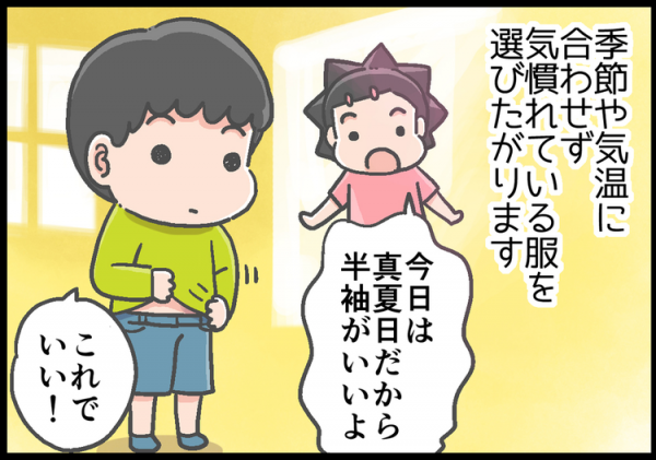 それに、着慣れた服でないと落ち着かないようで、暑くなってきて周りが半袖に切り替え始めても冬服で出かけようとします。もともと周りの人が何を着ているか観察もしないし、着る物に無頓着なことも、温度調節を難しくさせている理由の一つかもしれません。