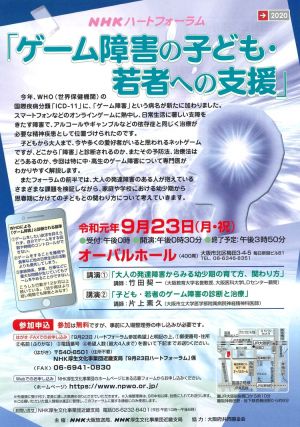 【講演会】「ゲーム障害」、その予防や治療法とは?――NHKハートフォーラム「ゲーム障害の子ども・若者への支援」(大阪府)