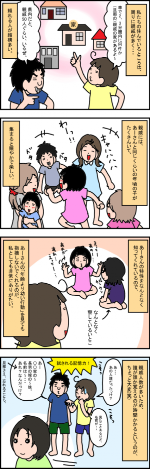 コミュニケーションが苦手な娘ですが、こういった人の集まりは大好き。娘は「誕生日会」「進学祝い」などの集まりをいつも楽しみにしています。いとこたちと遊び、楽しそうな娘を見ると、親戚同士の集まりは、子どもたちにとって大切なのだと感じます。