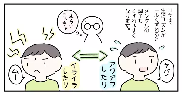 生活リズムが崩れることによって、コウは機嫌が悪くなったりパニックになったりしやすくなります。一度そういうコンディションになった彼相手に生活リズムを整えようとするのは大変なので、極力「崩さない」をモットーに休みを乗り切りたいところです。