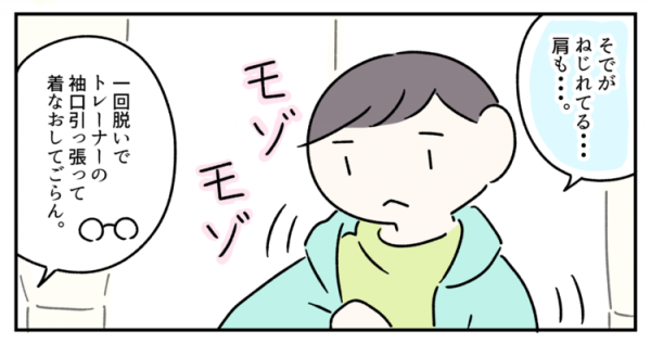 「”重ね着によるモゾモゾの違和感”だけではなく”インナーが出ている見た目の違和感”にも気を配ってくれ…!」という母の願いもどこ吹く風。コウ本人は何も気にしていないようで、「気がついたら出ちゃってるんだよねー」とニコニコしながらタンクトップのすそを出しっぱなしにしています。