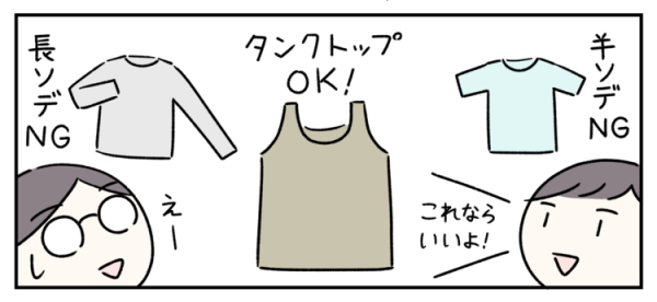 冬でもインナーは袖のないものしか着れないコウ。なぜ着れないのか聞くと、「もぞもぞして…なんか違和感がある」と言います。シャツやトレーナーに比べてインナーはタイトな作りのものが多いため、シワやよれができやすい上に”まとわりつく感じ”があって、どうにもダメなようです。
