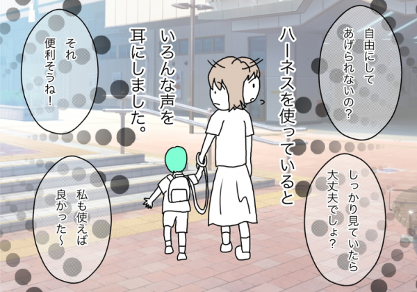 確かに見た目から犬の散歩のように見え、心ない言葉をかける人もいるかもしれません。が、お子さんの安全を守れるのは行動を共にする保護者だけなのですよね。また、ハーネスの存在によって、必要以上に子どもにきつく叱ることもなくて済む面もあると思います。言葉で言って聞かせてもまだまだ自分で行動を制御するのが難しい年齢の場合は、上手にハーネスを使うことで危険と折り合いをつけつつ“自由に歩く経験”ができるのではないかと思います。