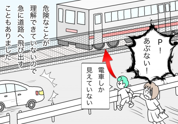 手をつないでいても振り払ってしまうし、一瞬でその場から走り去ってしまうので何度もヒヤリとした体験をしていました。Pは何の前ぶれもなく突然行動することがあるので、前もって危険を回避したくても予測が困難なことばかりでした。これまでに1番ヒヤッとしたのは、道路の向こう側に電車が走っていたのをPが目にした瞬間に、歩道から道路へ急に飛び出したときです。道路と歩道の境界にはガードレールがあったので私も少し油断をしてしまっていたのですが、たとえそばを歩いていたとしてもとっさには防ぎきれないことがあるかもしれないことを実感しました。