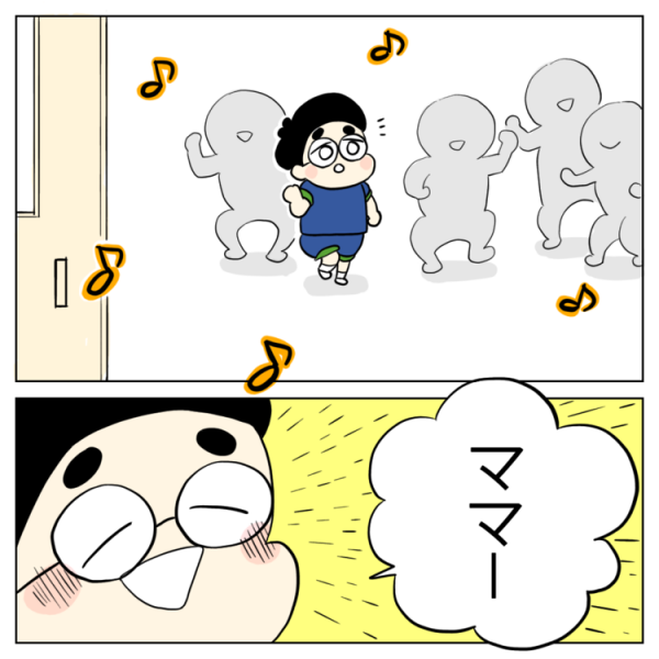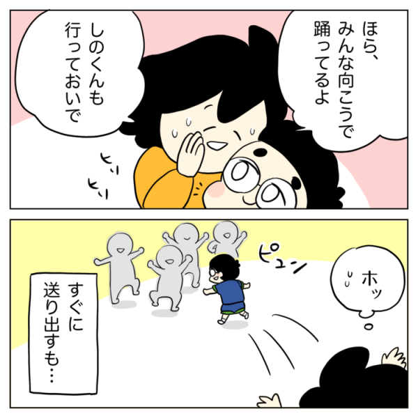 クラスのほかの子どもたちは、先生のピアノに合わせて踊っていて、保護者の元へ来たのはしのくんだけでした。しのくんに「みんな踊ってるよ。