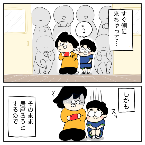 参観をする保護者の中から私を発見するなり、すぐ側に来てしまい、そのまま私のところにいようとする、しのくん。