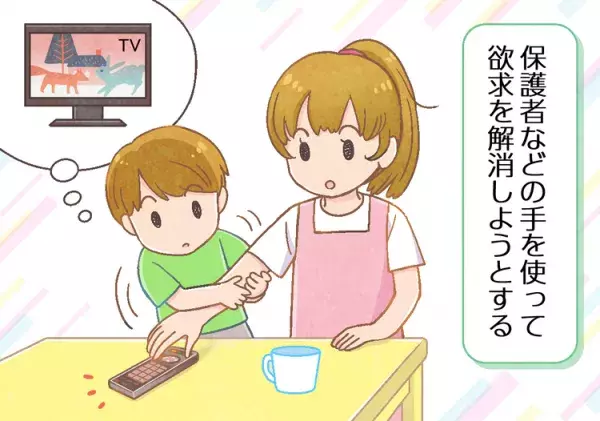 例えば、定型発達の子どもでもジュースをとってほしい場合には「ジュース」や「冷蔵庫」などの単語が分からなければ、意思を言葉で伝えることはできません。言葉や指さしでの要求がまだできない場合は、保護者の手を介してその欲求を伝えることも多くあります。