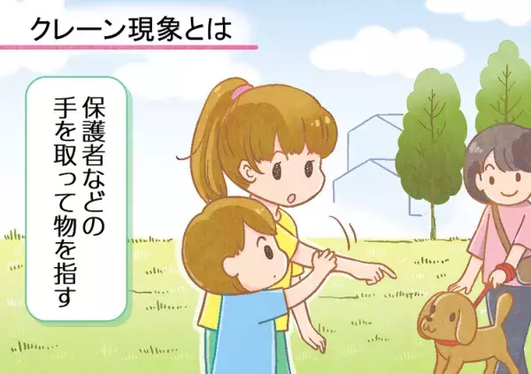 クレーン現象とは、子どもが何かをしたいときに、保護者やほかの人の手を取って物を指す、保護者やほかの人の手を使って欲求を解消しようとするなど、相手の手などで自分の要求を表現する動作のことです。まだ言葉が使えないので、動作で要求を実現させようとするものだと言われています。