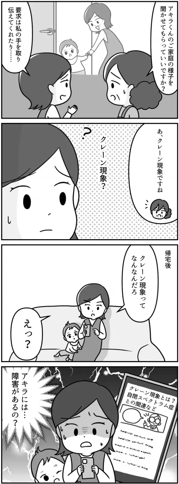 帰宅後、クレーン現象をスマートフォンで調べてみると、発達障害、ASD(自閉スペクトラム症)の記事がたくさん出てきて……「もしかして息子はASD(自閉スペクトラム症)なの?」と気づかされます。晴天の霹靂からの次回第3話「受給者証って何?申請と療育のはじまり」。続きもぜひご覧ください。