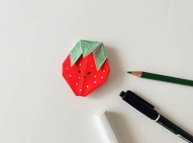 好きな色の折り紙を1枚使ってつくる、イチゴがのったカップケーキ。メッセージは工程⑦で書くよ。