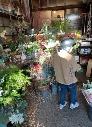 近所のお花屋さんに立ち寄り、息子と一緒にスワッグに使うお花を選びに行きました。