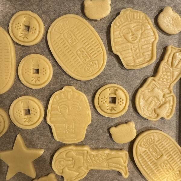 これはseriaで購入した、エジプトと古銭をモチーフにしたクッキー型。普通の星形やハートも可愛いけど、こんな面白い型だと子供だけじゃなくて大人も作るのが楽しかったです♪