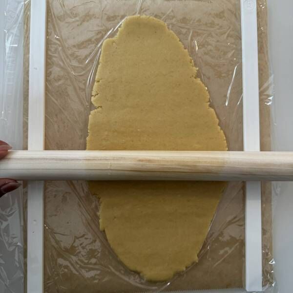 作った生地を簡単に5ミリの暑さに揃えてくれるのが、このクッキールーラー。生地の両端にクッキールーラーを置いて、めん棒で生地をゴロゴロすると、あっという間に均一な厚さの生地ができた! 他にも3ミリの厚さもありました!これは焼きむらもボコボコも出来なくて有難い!