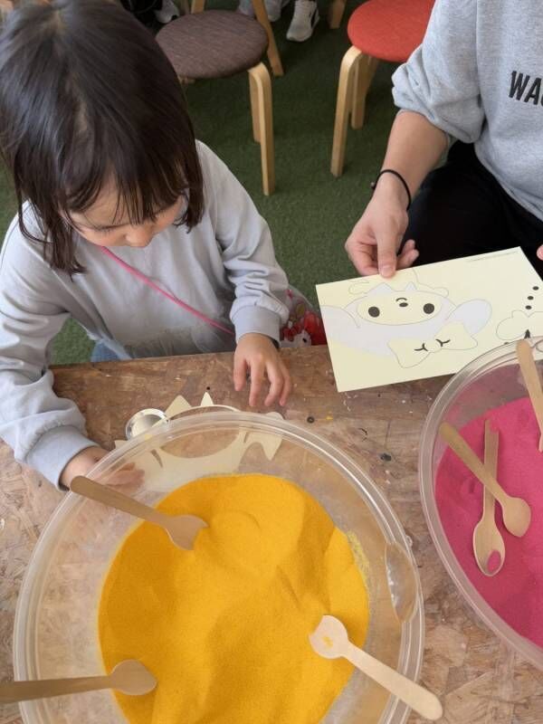 家族みんなで楽しめる体験コーナーは好きなキャラクターを自由に色付けして自分だけのオリジナル作品をつくる「素焼き絵付け体験」や、ペタペタ貼って遊ぶ「ビニール焼き画」、きれいな色の砂で絵を完成させる「砂絵」やマスコットすくいなど、いろいろな体験ができます!