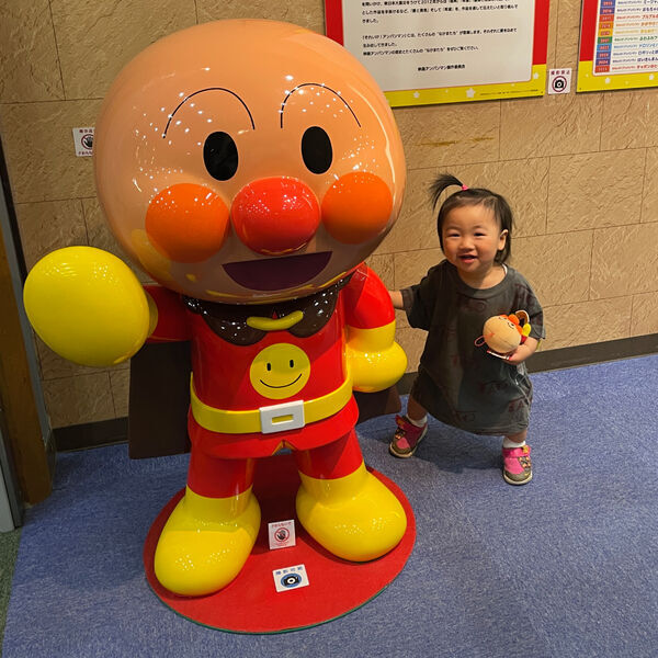 向かい側には、特大アンパンマンのぬいぐるみがベンチに座っており、一緒に座って写真が撮れます娘は特大アンパンマンの隣に座って満面の笑みに☺️