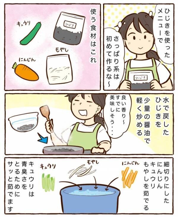 『育児』×『料理』をテーマに、野菜嫌いな長女ちゃんが奇跡的に食べたメニューや、子どもと一緒につくった料理など、チッチママさんのおいしくて愛情たっぷりの食にまつわるストーリーを連載します。思わず食べたくなるおいしそうな料理のイラストにも注目。第49回目は乾燥ひじきで子どもも喜ぶさっぱり副菜に初挑戦! 夏のつくり置きにもぴったりなレシピをご紹介!