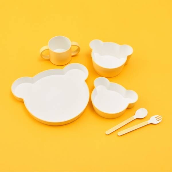 「ディッシュプレートベアやマグ、カトラリーの6点がセットになった〈タック〉のギフトボックス。離乳食が始まる頃から赤ちゃんが大きくなるまで長く使えるうえに、割れにくい丈夫な素材、スタッキング収納可、さらには食洗機OK、電子レンジOK(スプーン・フォークを除く)などいいことだらけ。なめらかな口あたりと手触りも◎」