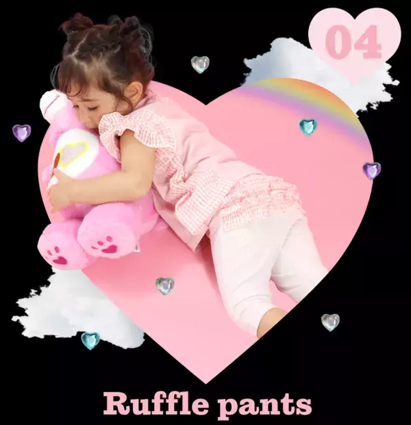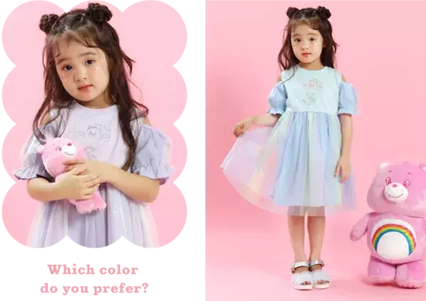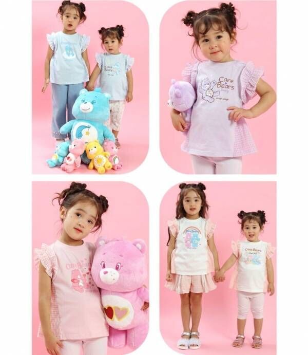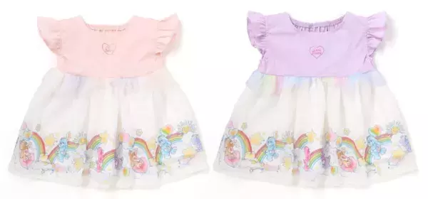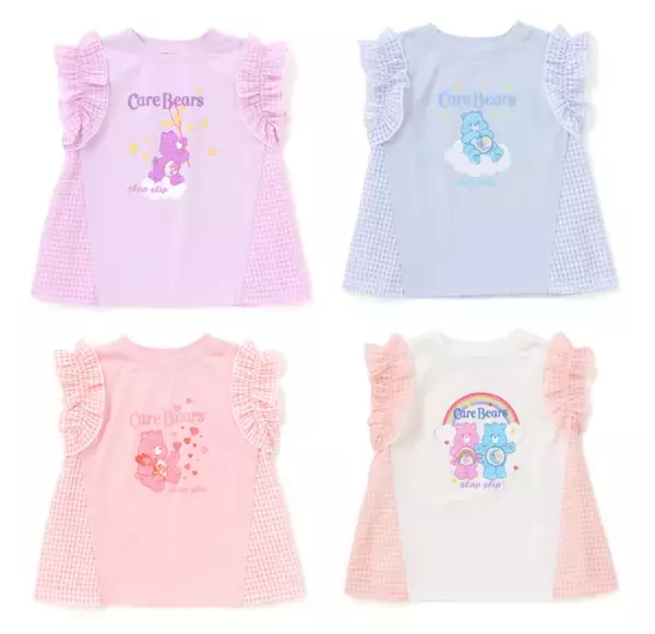 カラーによってイラストが違うデザインが楽しい4色展開です。ベビーサイズは柔らかなタッチのケアベアたち、キッズサイズはPOPなカラーのケアベアたちがプリントされています。サイドの切り替えと同じ柄の袖のフリルも可愛いポイントです♪