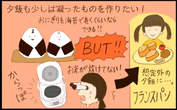 「よし、今日の夕食はちょっと凝るぞ!」と意気込み、おにぎりに海苔を巻いてお内裏様(おだいりさま)とお雛様に見立てようと考えましたが、炊飯器を開けてびっくり。なんとお米が炊けていません!ひな祭りの主食は、ストックしていたフランスパンになってしまいました。