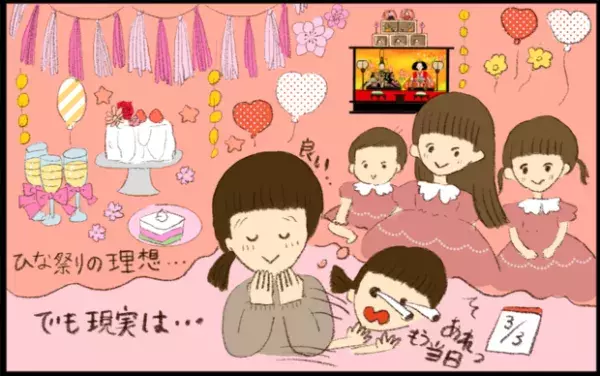 わたしの理想のひな祭りといえば、「ひな祭りらしく飾り付けられた部屋、かわいい洋服を着た娘たち、手の込んだおしゃれなご飯とデザート、みんなでお歌を歌い記念撮影」です。日程に余裕を持ってひな祭りを準備したいと思っていたのですが、気が付いたら当日でした。