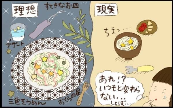 しかし、部屋の飾り付けや風船が割れるという思わぬハプニングで野菜を茹でるのが面倒に。薄く焼いた卵焼きを星形にくり抜いてそうめんの上に散らしただけとなりました。