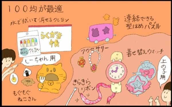 しーちゃんのクリスマスプレゼントを夫と悩んだ末に向かったのは、おもちゃ屋さんではなく100均。最近の100均は、子どものおもちゃがたくさん売っていますよね。予算を気にせずプレゼントを選ぶことができるので、今年のサンタからのクリスマスプレゼントは100均にお世話になることにしました。そして、いたずら盛りであちこちにクレヨンで落書きをすることが大好きなしーちゃんに、水で拭き取れるクレヨンとスケッチブックを買いました。壁やテーブルなどにクレヨンで落書きをされても水で簡単に落とすことができますし、消耗品なので安くゲットできてとってもありがたい!