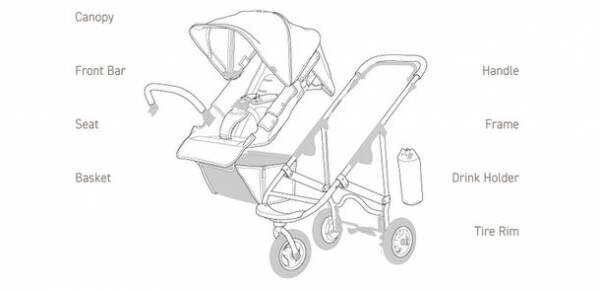 フレームに合わせて選べるパーツは、シートキャノピー&バスケット13色、フロントバー5色、ドリンクホルダー5色、タイヤリム2色から自由に組み合わせることができます。