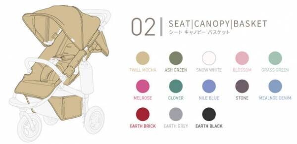 シートキャノピー&バスケットには秋冬新色のTWILL MOCHA(ツイルモカ)の他、カラーズ限定色ASH GREEN(アッシュグリーン)とSNOW WHITE(スノーホワイト)が追加され、組み合わせパターンは520種類も。