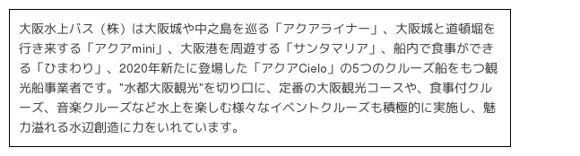 また、当社ではこれまでにも、水の路(比叡山から琵琶湖、京都、宇治を経て大阪湾に至る淀川水系)のコンテンツ創造や魅力発信、沿川の活性化に寄与すべく、定期観光船「淀川浪漫紀行」を運航してきました。
